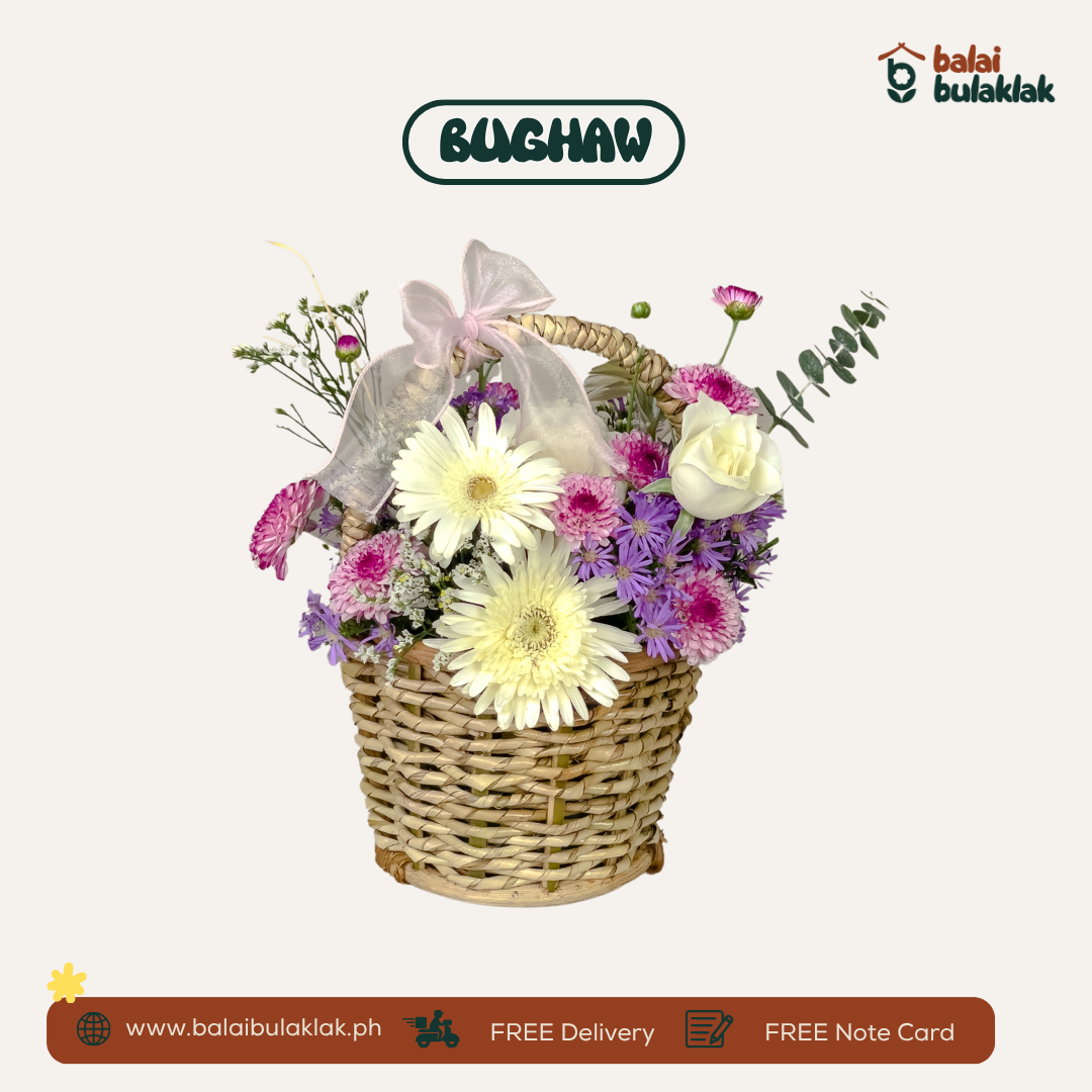 Bughaw ay isang flower basket na puno ng lambing at pag-asa. Binubuo ito ng white gerbera, light purple asters, at pink mums na nagbibigay ng banayad na kulay at pakiramdam ng kapanatagan. Isang simpleng handog na kayang magpagaan ng loob ng sinumang makatatanggap nito.