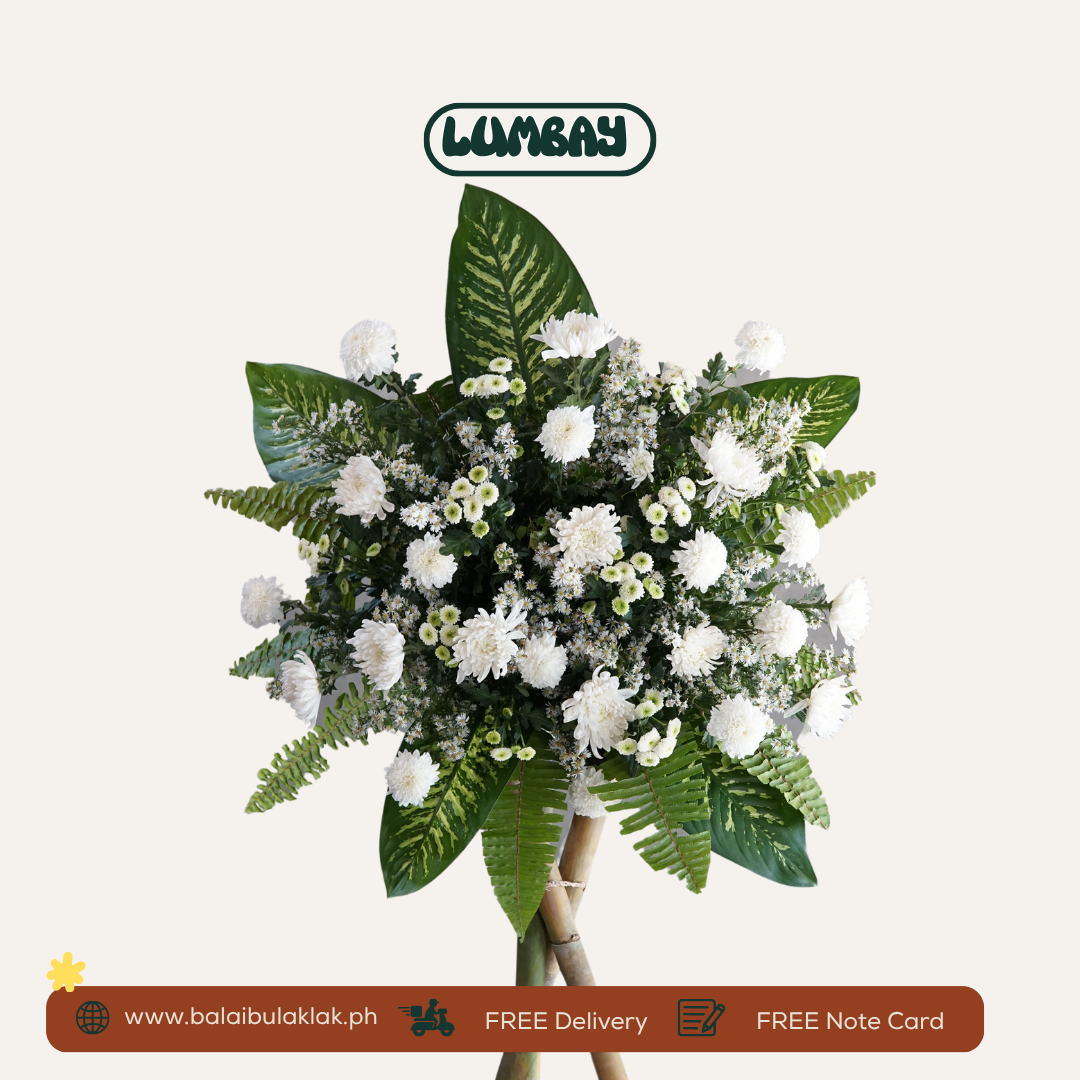 Tahimik, payak, at puno ng damdamin—Lumbay ay isang funeral standee na sumasalamin sa malalim na pagdadalamhati. Binubuo ito ng White chrysanthemum at green button mums. Isang simbolo ng tahimik na pamamaalam at pag-alala sa mga nauna sa atin.