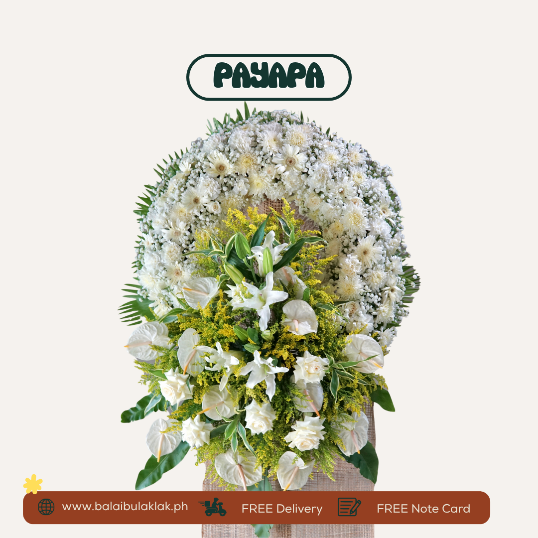 Isang Funeral Wreath na ginamitan ng puting anthurium, lilies, roses, mums, at baby’s breath. Ang Payapa ay disenyo para maghatid ng tahimik na pagpapaalam—isang pahiwatig ng respeto at pagmamahal sa yumaong mahal sa buhay.