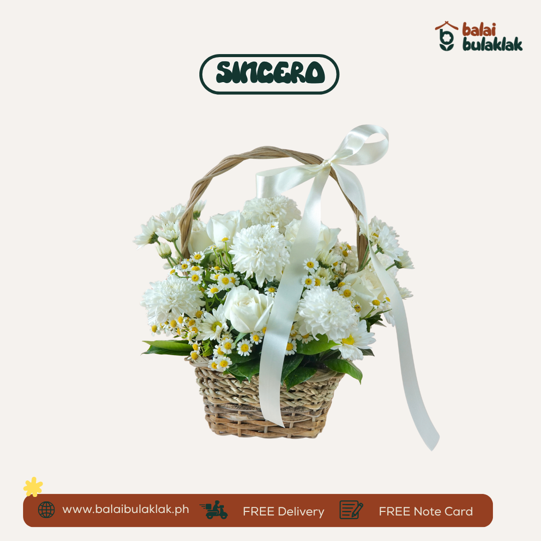 Isang maaliwalas at mapayapang handog na may halong puti’t dilaw na bulaklak gaya ng mums, white roses, daisy poms, at asters. Ang Sincero ay bagay ipadala bilang pakikiramay o bilang paalala ng pag-aalaga sa mga nagpapagaling.